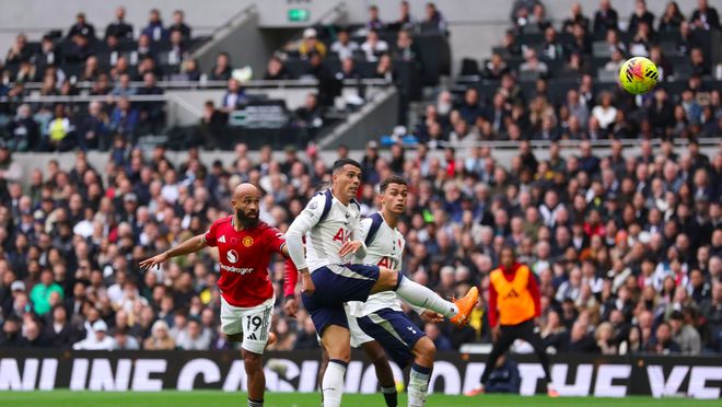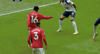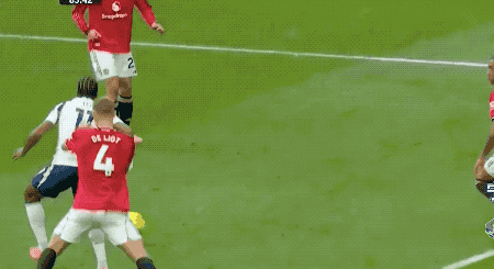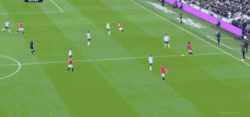 顶住了热刺的狂轰滥炸,第69分钟,阿玛德·迪亚洛送出精准长传,B费的停球世界级,但帕利尼亚迅速赶到,B费仓促出脚,放了高射炮。