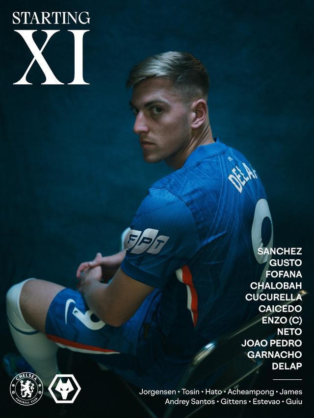 切尔西首发:1-桑切斯、27-古斯托、29-福法纳、23-查洛巴、3-库库雷利亚、25-凯塞多、8-恩佐、7-内托、20-佩德罗、49-加纳乔、9-德拉普