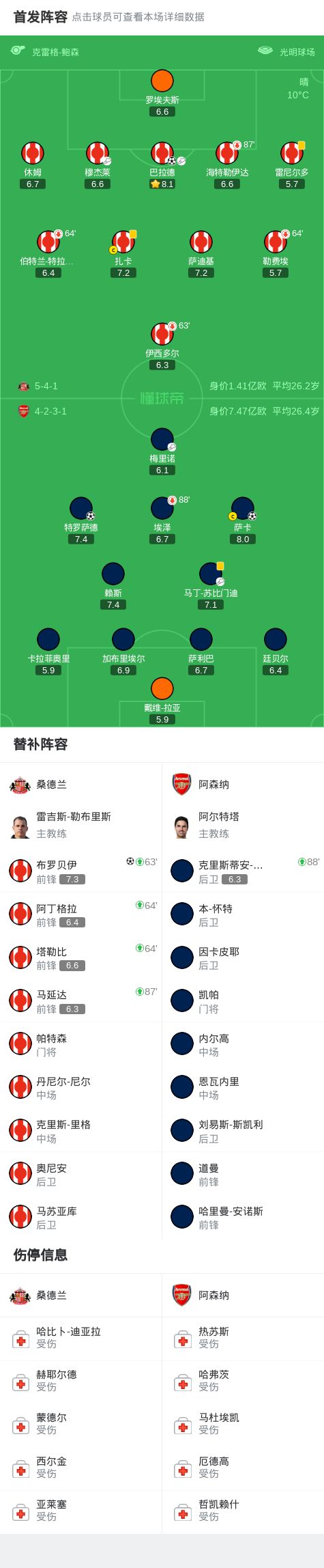 北京时间11月9日1:30,英超第11轮继续进行,阿森纳作客光明球场挑战桑德兰,本场主裁判为克雷格-鲍森。上半场,穆杰莱助攻巴拉德破门。下半场,梅里诺助攻萨卡扳平比分,特罗萨德世界波助阿森纳反超;补时阶段,布罗贝伊高难度凌空破门绝平。最终,阿森纳客场2-2战平桑德兰,各项赛事十连胜遭终结。